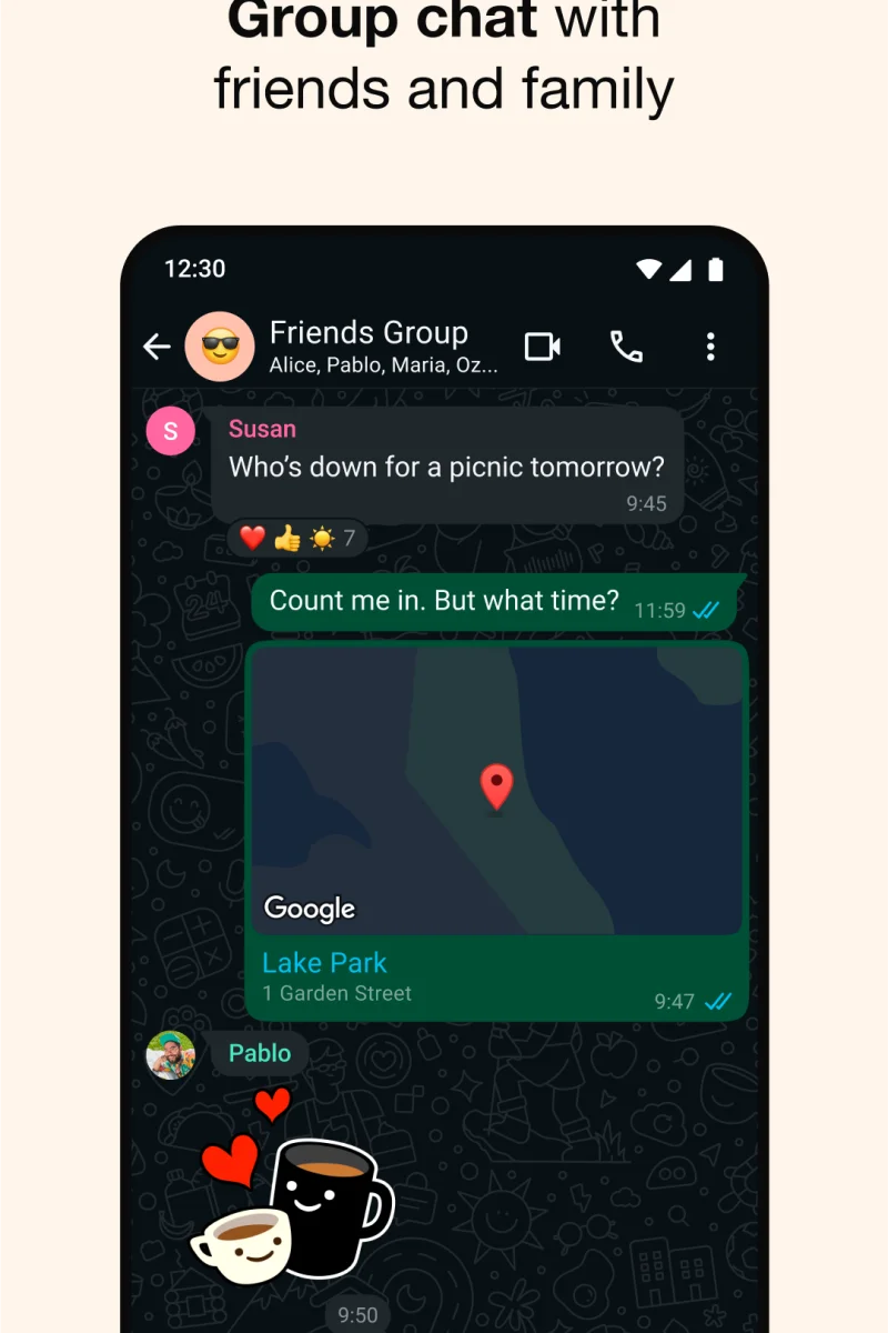 In WhatsApp, communication is the main goal, so you can say what you want to a lot of people at the same time. With the groups feature, you'll be able to have a conversation room (with all the above-mentioned features, even video calls!) gathering a lot of people at the same time. But, if you just want to send a message to several friends at the same time, WhatsApp Messenger also offers the Broadcast feature: choose the contacts that will receive it and you'll not need a chat room with all of them.